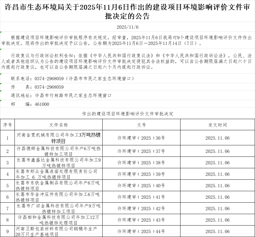 许环建审〔2025〕41号长葛市华金冲压件有限公司年加工6万吨热镀锌项目环境影响报告书的批复.pdf