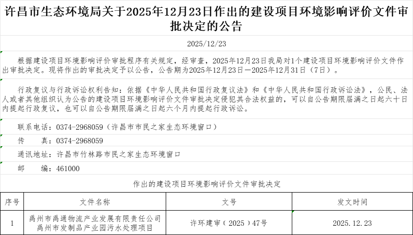 许环建审〔2025〕47号禹州市禹通物流产业发展有限责任公司禹州市发制品产业园污水处理项目环境影响报告书的批复.pdf