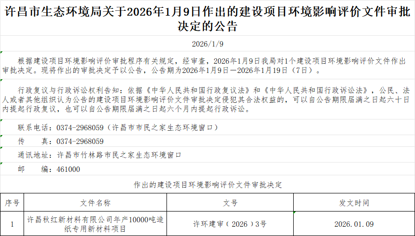 许环建审〔2026〕3号许昌秋红新材料有限公司年产10000吨造纸专用新材料项目环境影响报告表的批复.pdf
