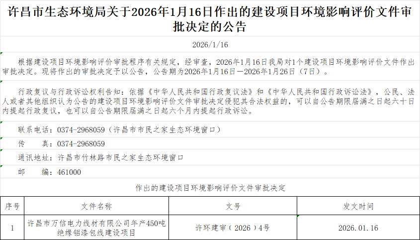 许环建审〔2026〕4号许昌市万信电力线材有限公司年产450吨绝缘铝漆包线建设项目环境影响报告书的批复.pdf