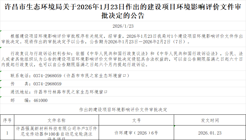 许环建审〔2026〕6号许昌强晟新材料科技有限公司年产3万件尼龙传动器和100套自动尼龙轮环境影响报告表的批复.pdf