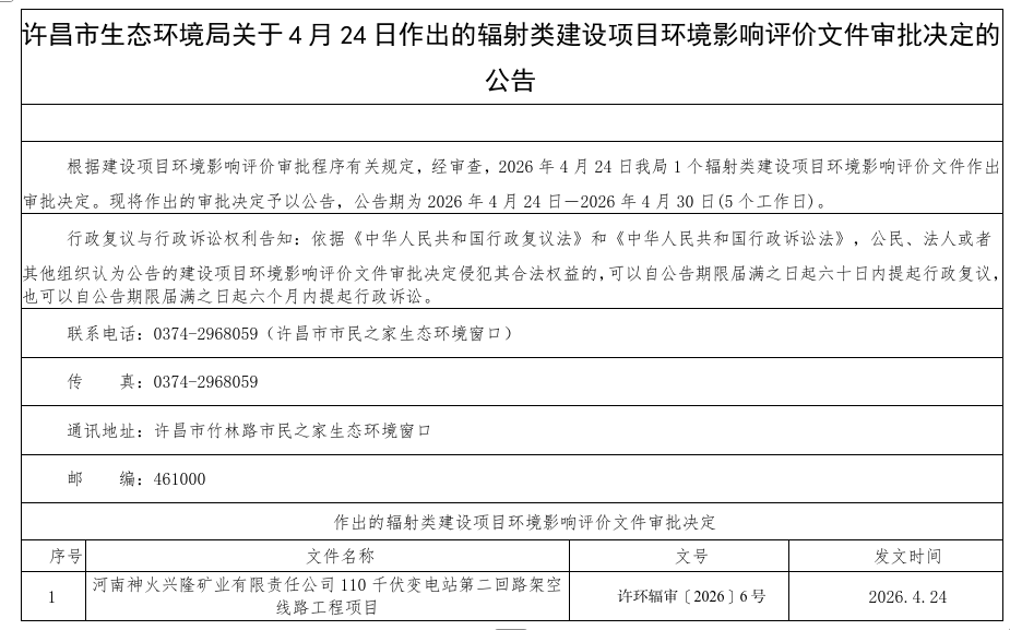 许环辐审〔2026〕6号关于110千伏变电站第二回路架空线路工程环境影响报告表的批复(1).pdf